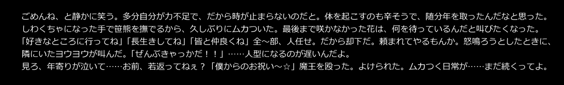카케루 「이상! 인족 여러분의 일상(일부 전투 중)과, 그 일상을 지키려 힘내는 옥족 여러분이었습니다!」
