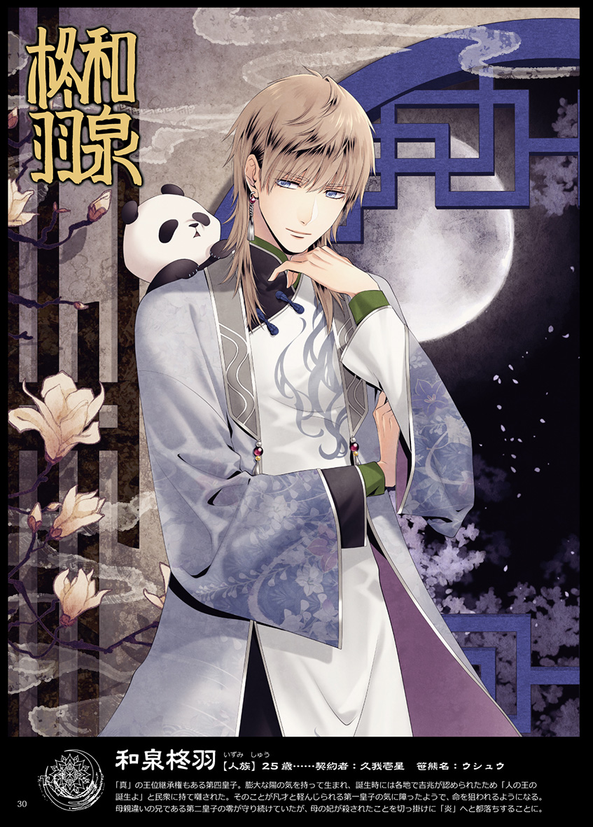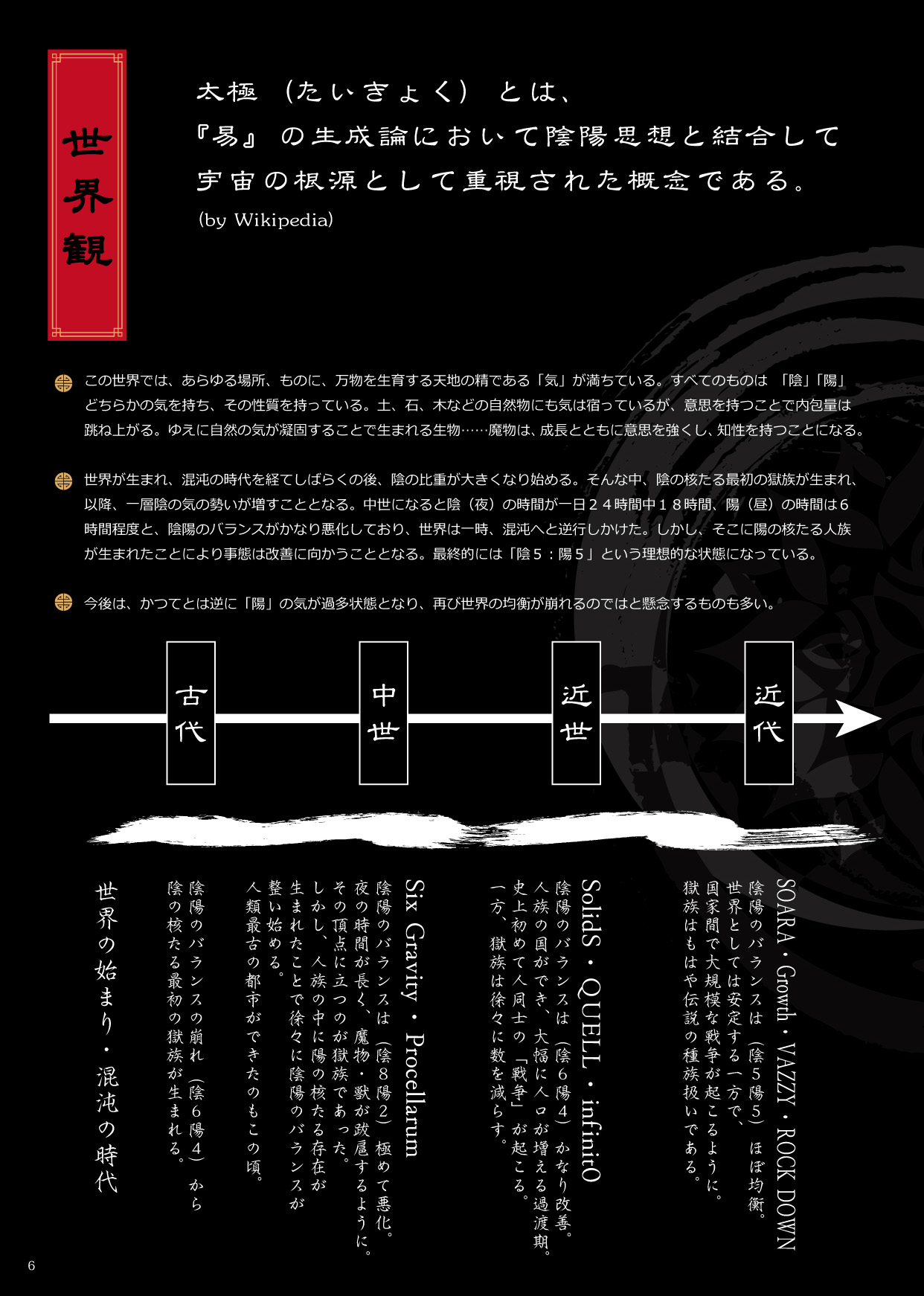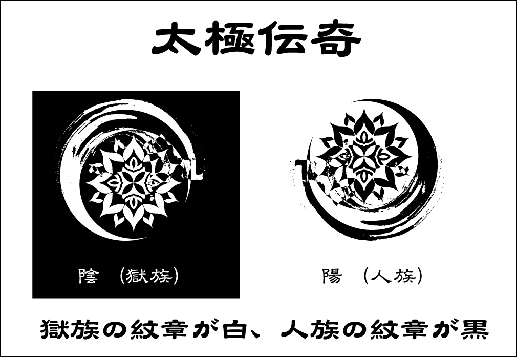 『음과 양(陰と陽)』이 테마인 태극전기. 디자인에 들어간 옥족(음)의 문장(紋章)이 하양이고, 인족(양)이 문장(紋章)이 검정이라, 보통의 태극도와는 반대지.